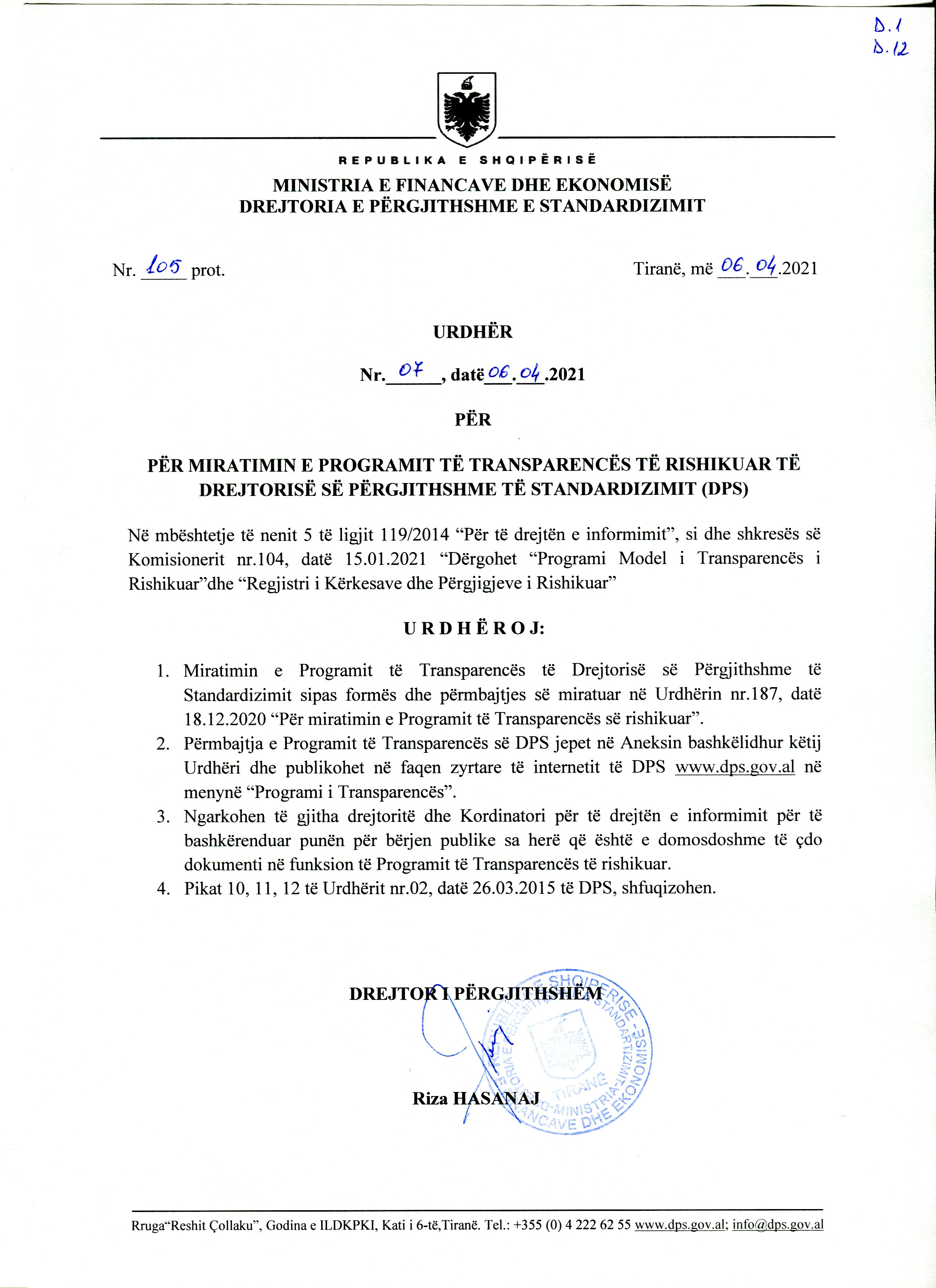 Në përputhje me nenin 7 të ligjit nr.119/2014 “Për të Drejtën e Informimit” (në vijim “LDI”), Autoriteti Publik (Drejtoria e Përgjithshme e Standardizimit, në vijim “DPS”) publikon Programin e Transparencës (në vijim “PT”) të miratuar nga Drejtori i Përgjithshëm i DPS.