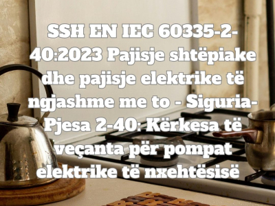 SSH EN IEC 60335-2-40:2023 "Pajisje shtëpiake dhe pajisje elektrike të ngjashme me to - Siguria - Pjesa 2-40: Kërkesa të veçanta për pompat elektrike të nxehtësisë"