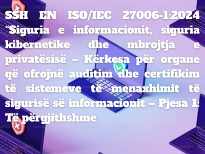 SSH EN ISO/IEC 27006-1:2024 “Siguria e informacionit, siguria kibernetike dhe mbrojtja e privatësisë – Kërkesa për organe që ofrojnë auditim dhe certifikim të sistemeve të menaxhimit të sigurisë së informacionit – Pjesa 1: Të përgjithshme".