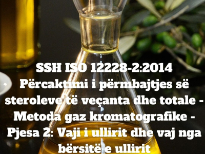 SSH ISO 12228-2:2014 Përcaktimi i përmbajtjes së steroleve të veçanta dhe totale - Metoda gaz kromatografike - Pjesa 2: Vaji i ullirit dhe vaj nga bërsitë e ullirit